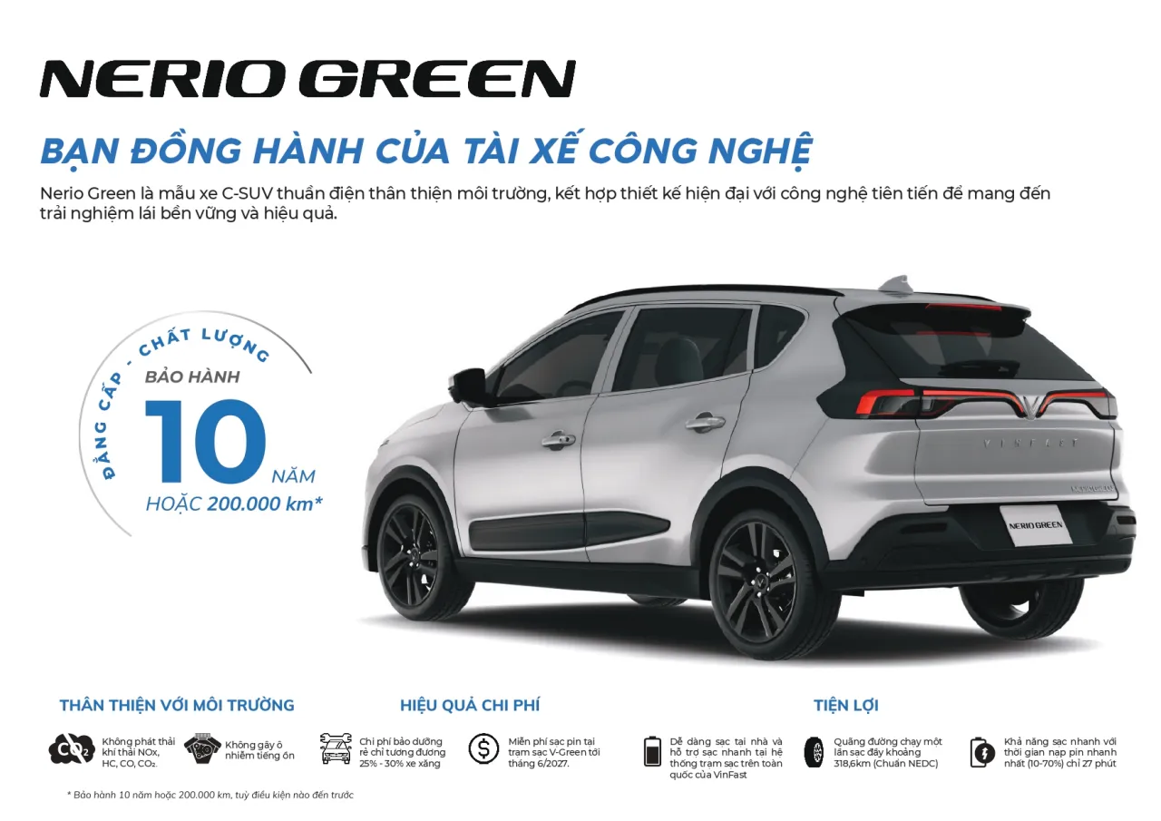 Cỗ máy điện trên Nerio Green giúp xe vận hành tối đa 318,6 km sau mỗi lần sạc đầy, thời gian sạc pin từ 10% lên 70% là 27 phút. Xe có 3 chế độ lái, gồm Eco, Comfort và Sport. Cùng với đó là gói an toàn nâng cao ADAS và Smart Services, gia tăng sự an tâm và tiện lợi cho người dùng.