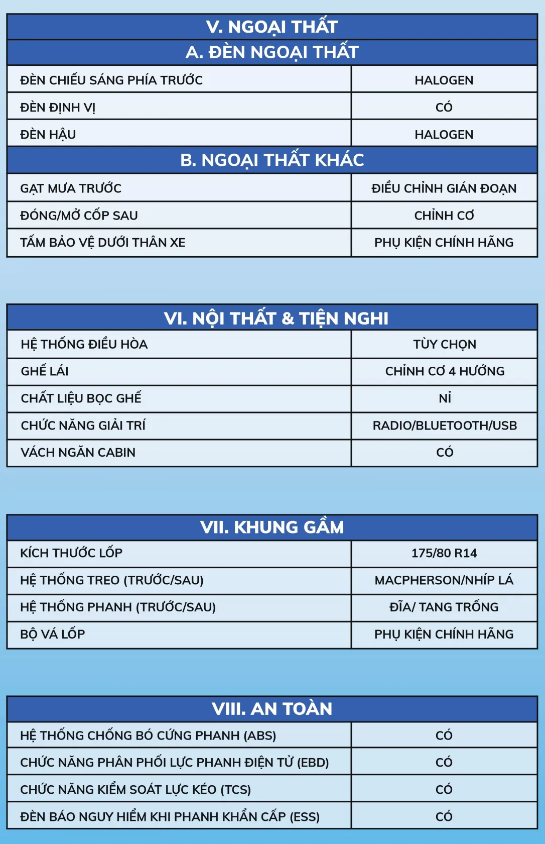 Cùng với đó là các trang bị như: ghế bọc nỉ, ghế lái chỉnh cơ 4 hướng, Radio/Bluetooth/USB, hệ thống điều hòa tùy chọn.