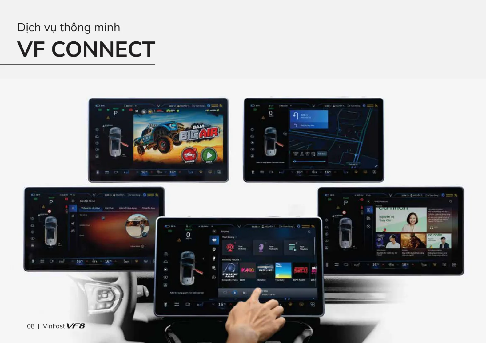 Không gian nội thất VinFast VF8 thiết kế theo phong cách tối giản nhưng vô cùng sang trọng với loạt tiện ích hướng tới tương lai. Thoạt nhìn, khoang lái VF8 dễ khiến chúng ta liên tưởng đến những chiếc xe thuộc phân khúc cao cấp trên thi trường.