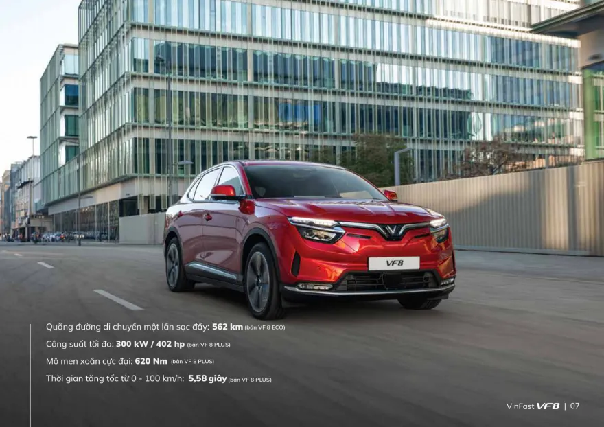 Theo công bố từ nhà sản xuất, VF8 có thể chạy được 400 – 420 km cho mỗi lần sạc đầy. Thời gian tăng tốc từ 0-100 km/h của xe là 5,5 giây.