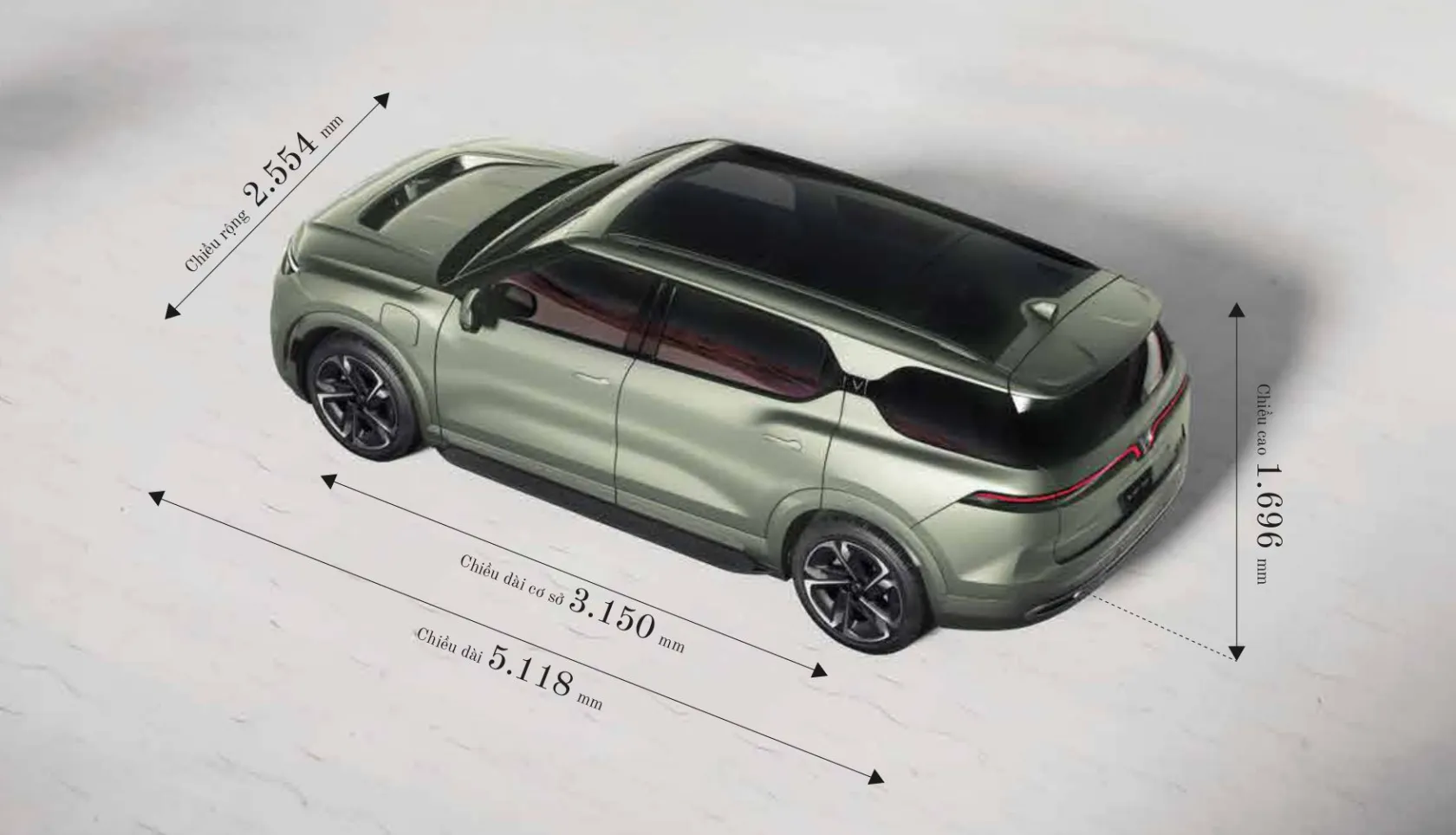 Vốn là mẫu xe đầu bảng của VinFast nên các thông số kích thước của VF9 cũng lớn nhất trong chuỗi sản phẩm của hãng. Theo đó, chiều dài x rộng x cao của xe lần lượt là 5.120 x 2.000 x 1.721 (mm), tương đương với loạt mẫu SUV hạng sang như Lexus LX570, Mercedes-Benz GLS hay BMW X7.