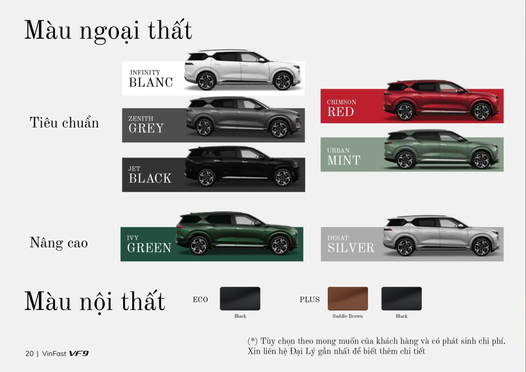 Xe có cấu hình 3 hàng ghế với 6 chỗ ngồi. Trong đó hàng ghế sau thiết kế kiểu thương gia sang trọng cùng loạt tiện ích hiện đại, tiện dụng. Khách mua xe VinFast VF 9 2025 sẽ có tất cả 8 tùy chọn màu ngoại thất, gồm: Brahminy White (trắng), Desat Silver (bạc), Neptune Grey (xám), VinFast Blue (xanh), Sunset Orange (cam), Crimson Red (đỏ), Jet Black (đen), Deep Ocean (xanh đậm).