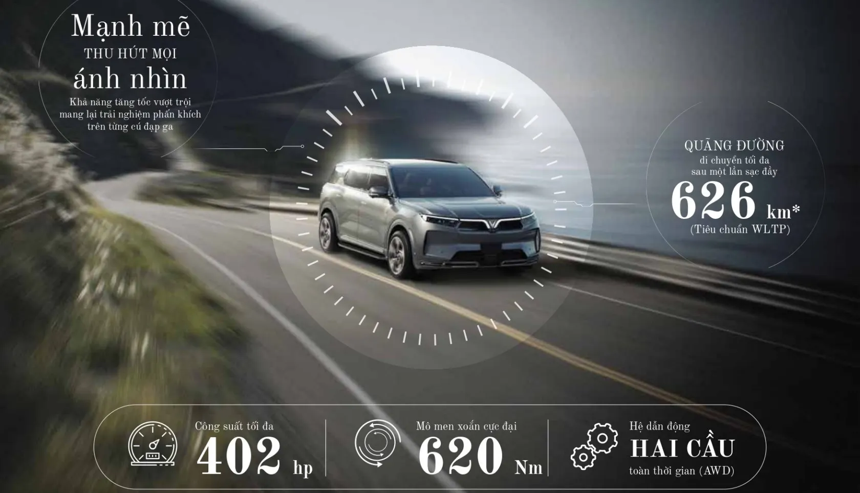 VinFast VF 9 sử dụng động cơ điện, sản sinh công suất tối đa 402 mã lực và mô men xoắn cực đại 620 Nm. Kết nối với đó là hệ thống dẫn động 4 bánh toàn thời gian, cho khả năng tăng tốc từ 0-100 km/h trong 6,5s.